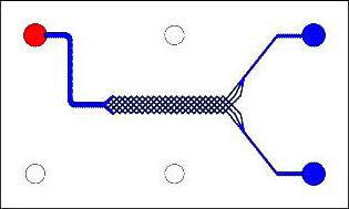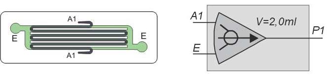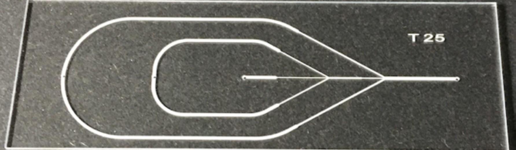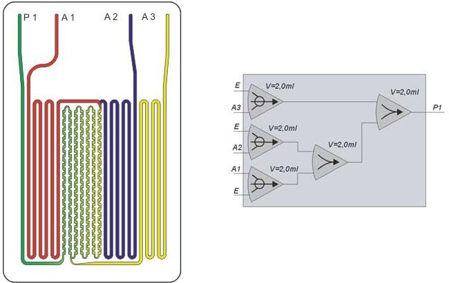 Size: 25 * 75 * 1,0 mm Volume of mixing zone: 0.47 µl Volume of reaction zone: 3.30 µl Inlets / Outlets: 3-1